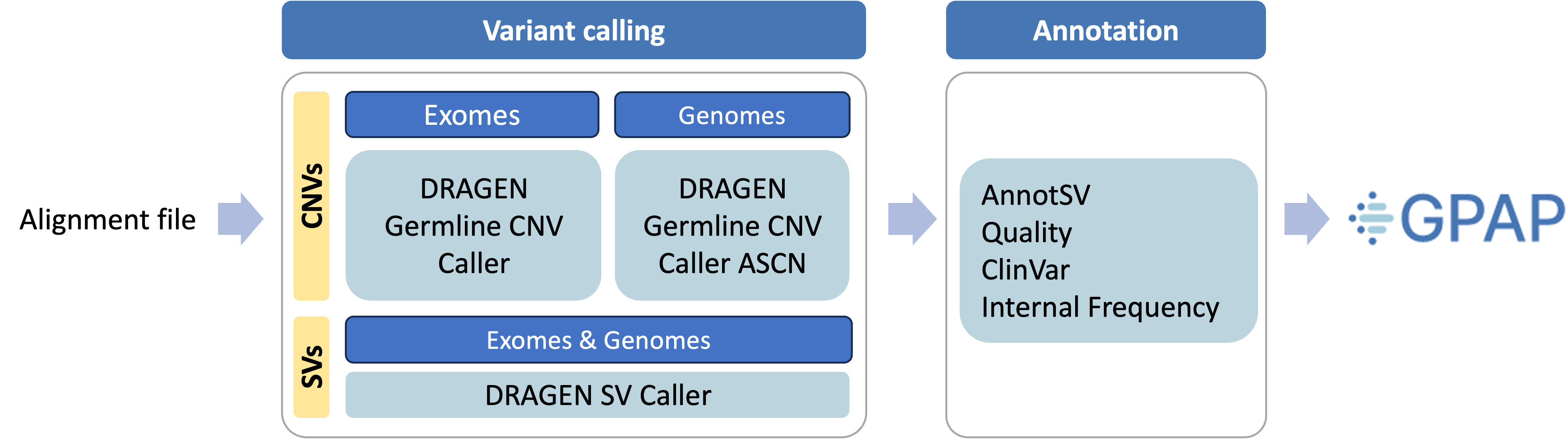 AnnotSV is used to annotate and harmonize the outputs of all the CNV/SV callers. This tool provides functional, regulatory and clinical annotations for CNV/SV interpretation. The most relevant annotations will be displayed in the GPAP main results table.