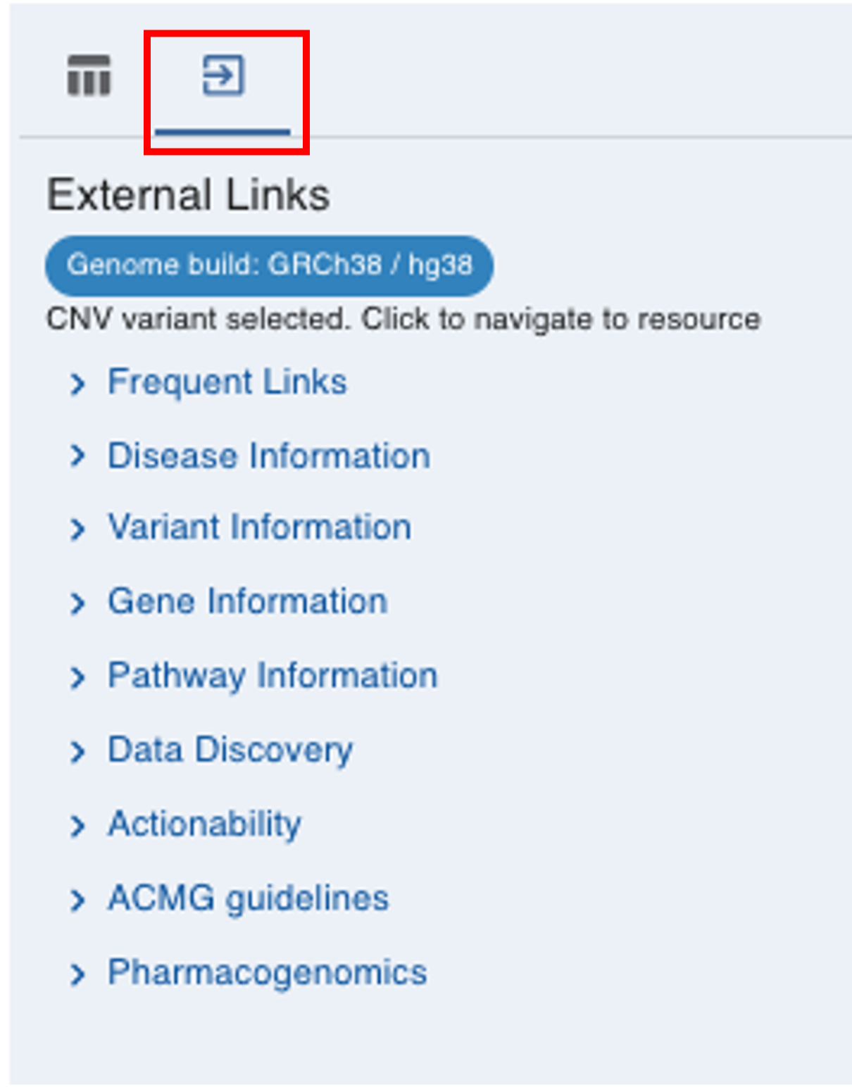 Additional information about SNV/InDels and CNV/SV variants can be accessed by selecting a variant and clicking the external links icon (see image below), which provides access to relevant external resources (see the External Links and Databases section in Variant Dashboard).