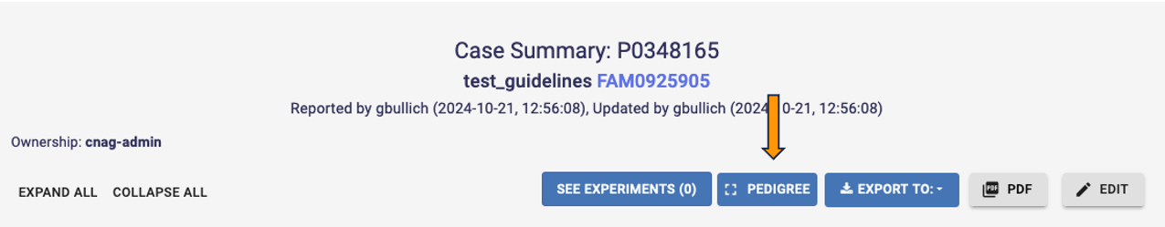 You can enter a Pedigree (and export an image of it) by accessing a participant Case Summary (see Browse PhenoStore cases section for further details) and clicking on the Pedigree button.